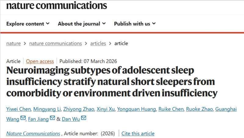 中国青年报客户端讯(中青报·中青网记者 王烨捷)近日,浙江大学生物医学工程与仪器科学学院吴丹教授团队与国家儿童医学中心、上海交通大学医学院附属上海儿童医学中心发育脑科学实验室脑智发育中心王广海研究员团队携手攻关,在青少年睡眠不足研究领域取得重要进展。相关研究成果以《青少年睡眠不足的神经影像亚型可区分天生短睡眠者与共病或环境驱动的睡眠不足》为题,发表于国际学术期刊《Nature Communications》(《自然通讯》)上,首次利用脑皮层厚度相关模型实现青少年睡眠不足的客观神经影像学分型,为该问题的个性化分层干预开辟了全新科学路径。