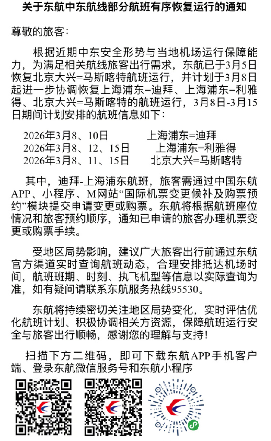 东航于3月5日恢复北京—马斯喀特航班,并计划于3月8日起进一步恢复上海—迪拜、上海—利雅得等航线。